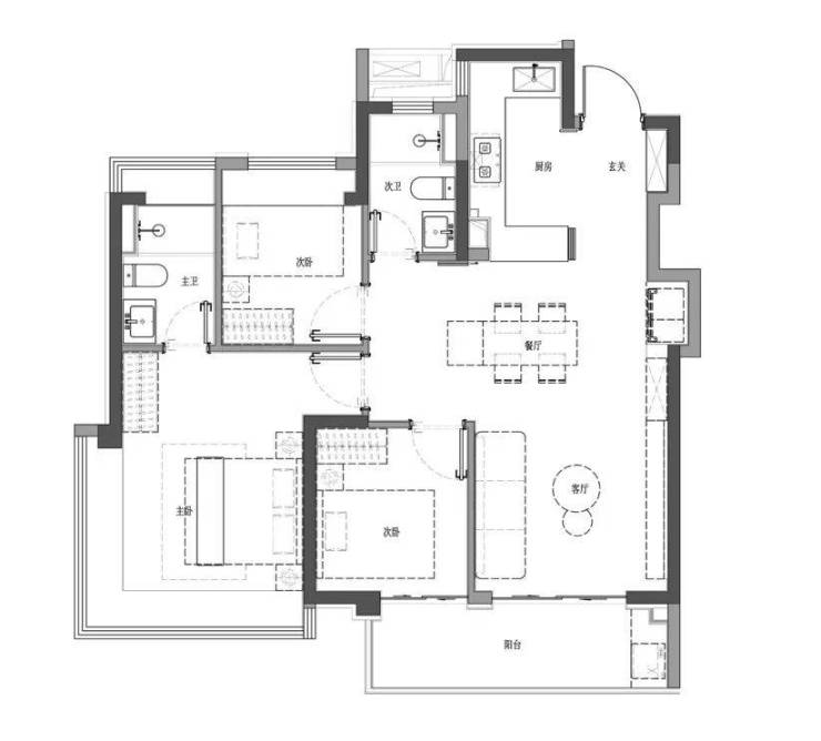 建面约100㎡三室两卫两厅,宽境从容