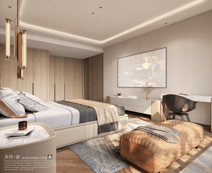 主卧中,Visionnaire Ripley 床架以低调奢华诠释休憩美学。深灰色真皮面料带着荔枝纹肌理,床头绗缝工艺暗藏对称美学,金属嵌条如精致腰带勾勒轮廓,与硬装艺术玻璃形成呼应。两侧悬浮床头柜轻盈悬空,玻璃台面与金属支架透着现代气息,柔和灯光洒在床品上,营造静谧安稳的睡眠氛围。