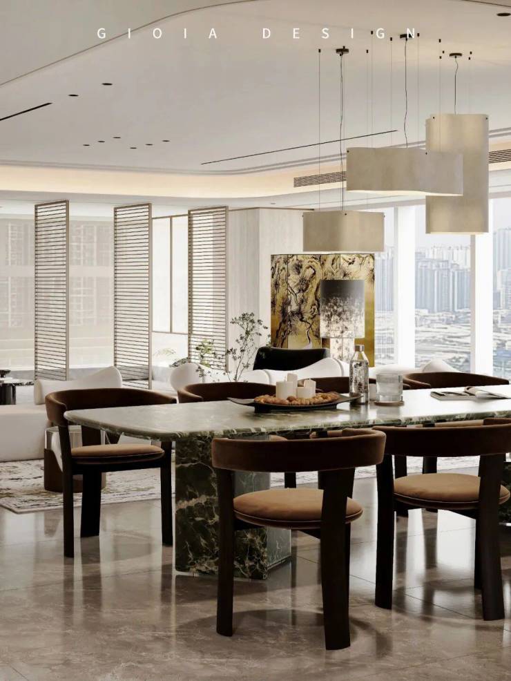 移步餐厅,Visionnaire Previous 餐桌以卡里冰玉大理石点亮空间。冰白色石材中若隐若现的浅灰纹路,如江南烟雨晕染的诗意,与翡丽风格芬迪白大理石墙面形成材质延伸。