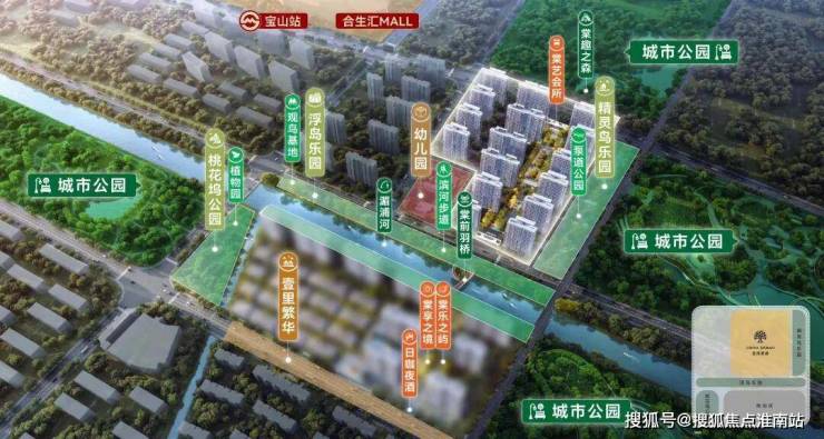 该项目属于宝山站TOD综合体的住宅组成,位于金茂棠前项目的北侧,仅相隔一条河道,项目地块总占地面积约42777.86㎡,容积率2.3,地上总建筑面积约106124.19㎡。