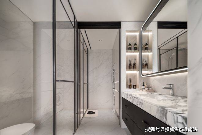 ✔卫生间地面和墙面整体性也非常强,奢石台面的纹路和岩板墙面和协调。