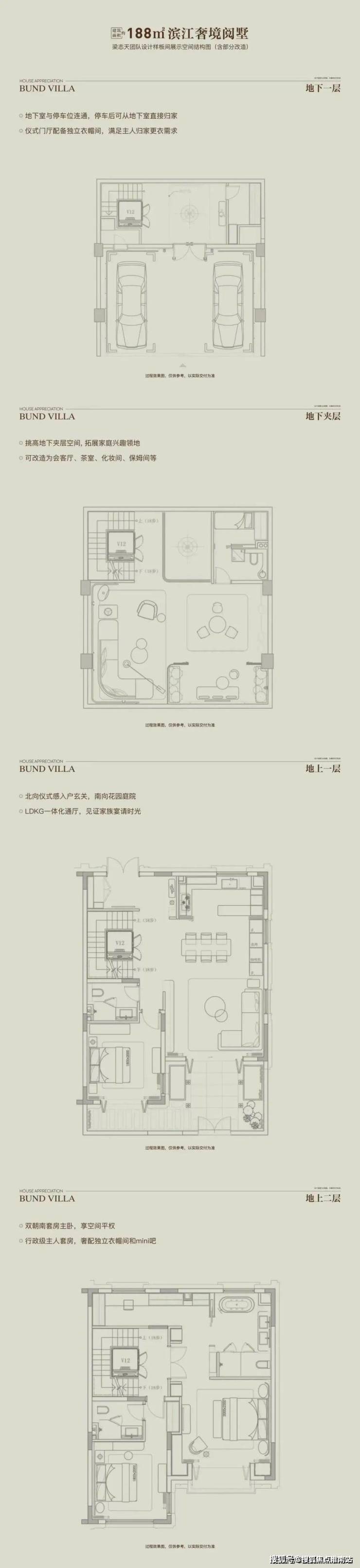 以 “全两层+会所”的形态革新、 花园露台地下室的全维空间、 大面宽短进深的奢适格局,重构别墅生活场景。