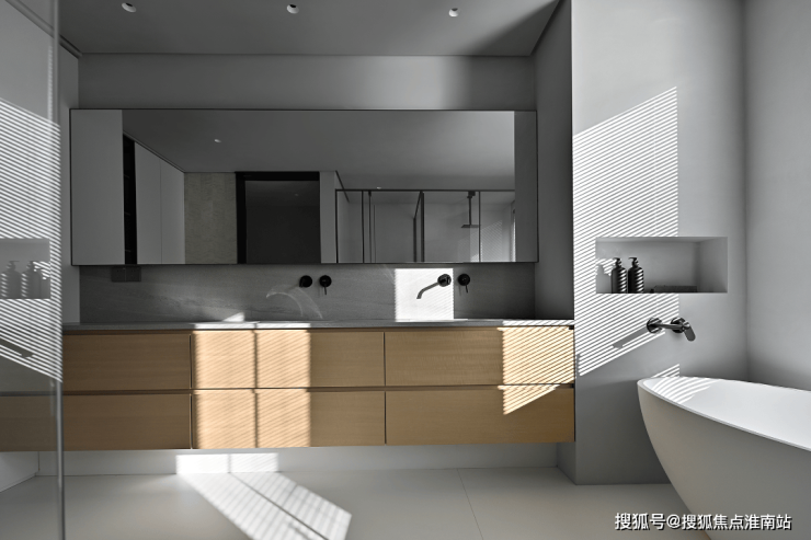 浴室贴心地做了三分离设计,完美践行了极简设计背后暗藏的功能主义。灰色与木色交融,创造出平和舒适的视觉体验。