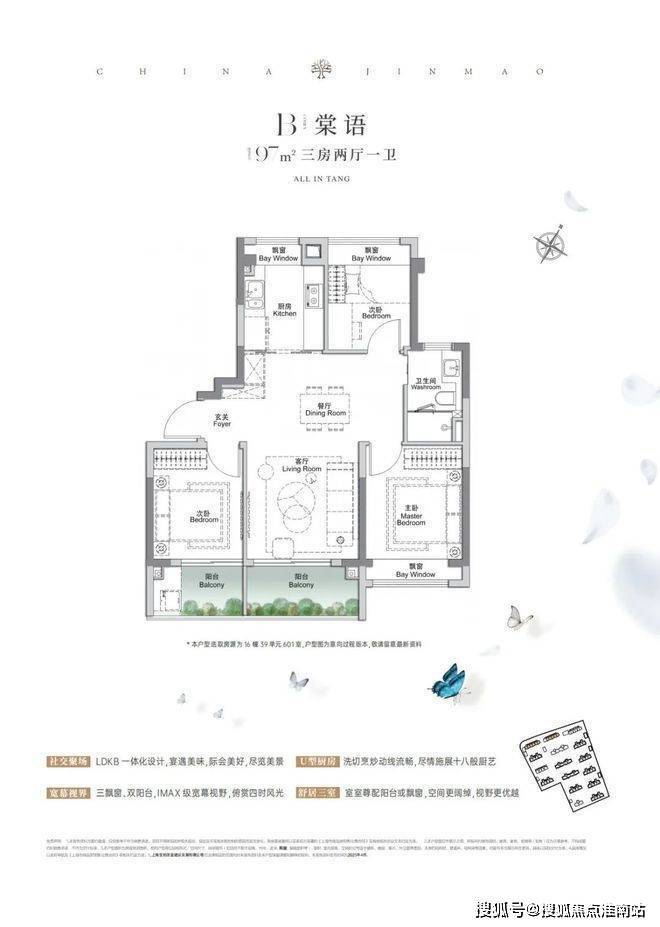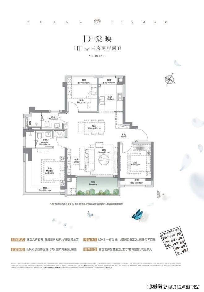 上海宝山金茂棠前官方售楼处电话☎:400-8818-994✔✔✔(预约看房热线)建面约105㎡三房:飞机户型没有浪费的过道面积,对空间的理解做到了极致,三开间朝南+4个飘窗+双面阳台系统+主卧套房设计+270°转角飘窗!