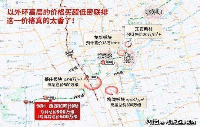 对比上海西南梅陇、莘庄等板块高层单价均已突破8万/㎡,而与外环外的颛桥、徐泾、九亭等区域高层单价也直逼6万/㎡。