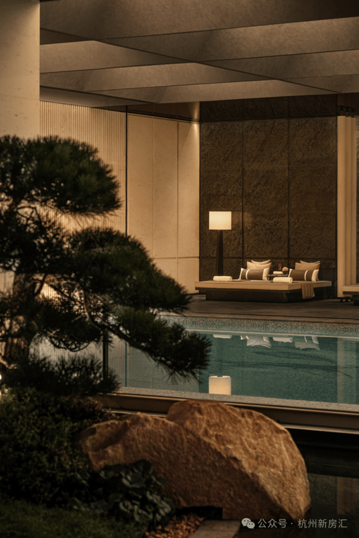 该有的下沉庭院、会所空间、恒温泳池、健身房、私宴厅等场景,松川境都有了。别人没有的「身处繁华,心如月满松枝」的山水意境,松川境也有。