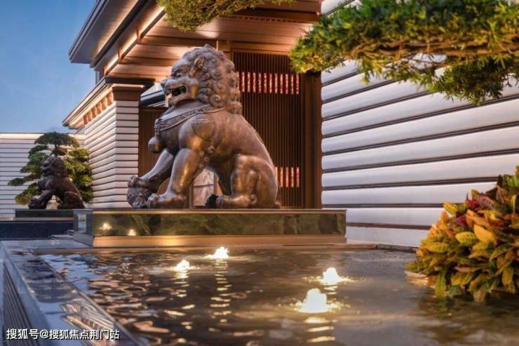 屋檐取形太和殿庑殿顶,两侧铜狮镇守、五步青云阶递进,涌泉灵动,琮黄色调沉稳铺陈。这不仅是归家的仪式,更是家族门风的当代写照,从第一眼即奠定东方礼序与不凡气场。