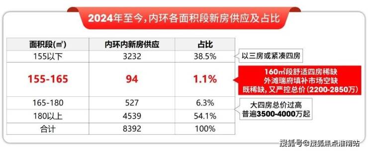 最关键的160㎡段——既能保证四房完整功能,又能兼顾每个空间尺度感的面积段, 去年至今内环供应占比仅约1% ,近乎断供状态。外滩瑞府约161㎡四房,正是今年内环首个该面积段的舒适四房,直接填补了市场空白。