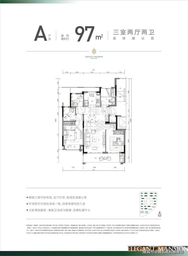 主力户型建面约97方三房户型: