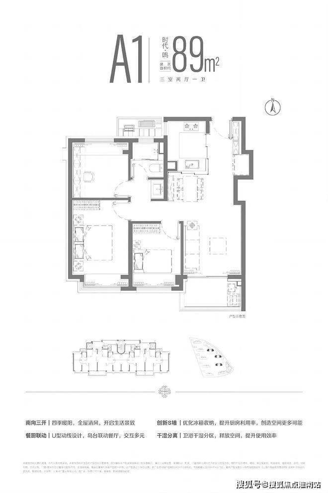 建面约89平的三房两厅一卫,400万级别主打低总价,三开间朝南,通过S墙的设计解决了冰箱空间问题。