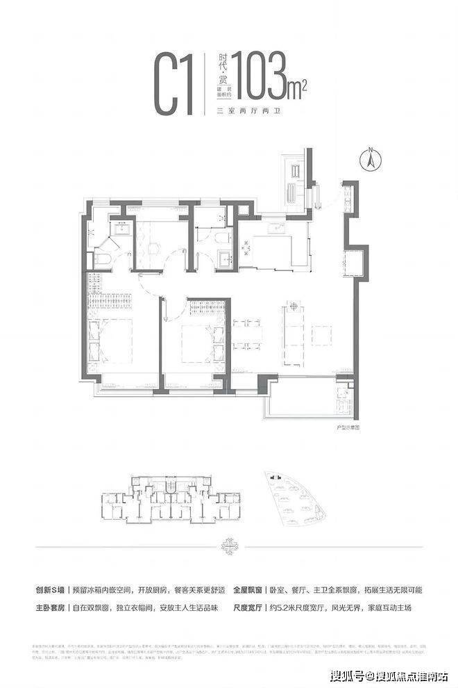 建面约103平的三房两厅两卫,做到了南北通透和大横厅设计,并且是横厅还是比较亮眼的。
