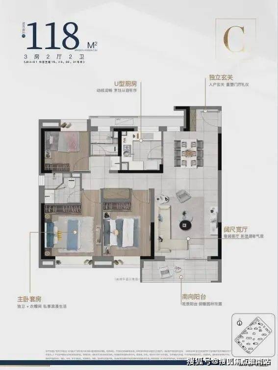 建筑面积约100㎡/118㎡三房两厅两卫,三口之家/三代同堂从容满足,南北通透外,餐客一体,动静分离居住舒适度更高,三开间朝南,三房全飘窗,日常在阳台上饲花弄草,生活将被赋予高仪式感。