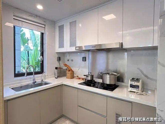 再往前走,左侧为L型厨房,预留了冰箱位,有采光窗,保证了厨房的换气和采光。