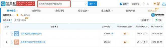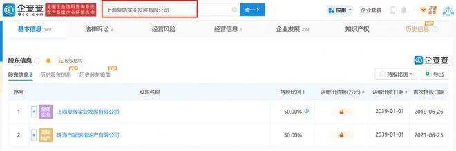 据企查查股权结构显示,复粤实业发展有限公司成立于2020年,由珠海市润瑞房地产有限公司、上海复莜实业发展有限公司联合控股,持股比例各为50%。