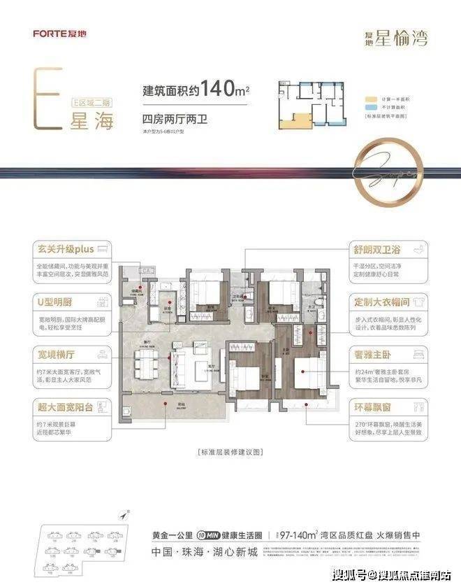 当前主推户型为:97-119-140㎡三房至四房两厅两卫,两梯四户,精装交付。