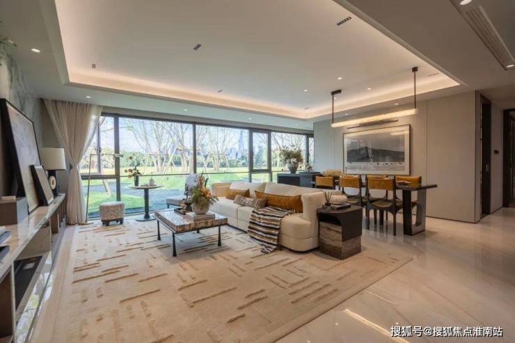 LDKG一体化设计,搭配大面落地玻璃,地面白金沙岩板通铺,吊顶是大通顶,双背景墙采用壁布硬包、帝王翡翠岩板,没有多余的结构墙体,以豪奢尺度构建出家庭交流的超级广域公区。