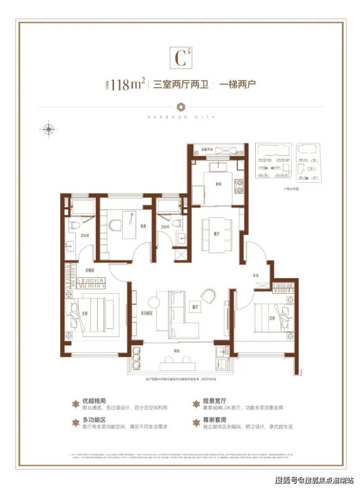 建面约99㎡爆款三房,飞机户型室内没有多余过道,避免面积浪费,空间利用率更高,得房率比同类型产品更优。三开间朝南+双卫设计+餐客连厅,汇集市面上三房户型的诸多优点,堪称刚需买房的顶配产品。