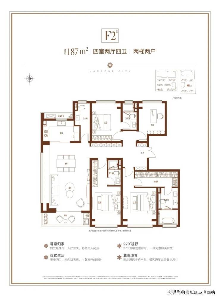 建面约157㎡四房户型,东侧阳台可观赏滨水风景,独立玄关+270°观景巨厅+主卧套房,完美诠释人生赢家的尊崇地位!