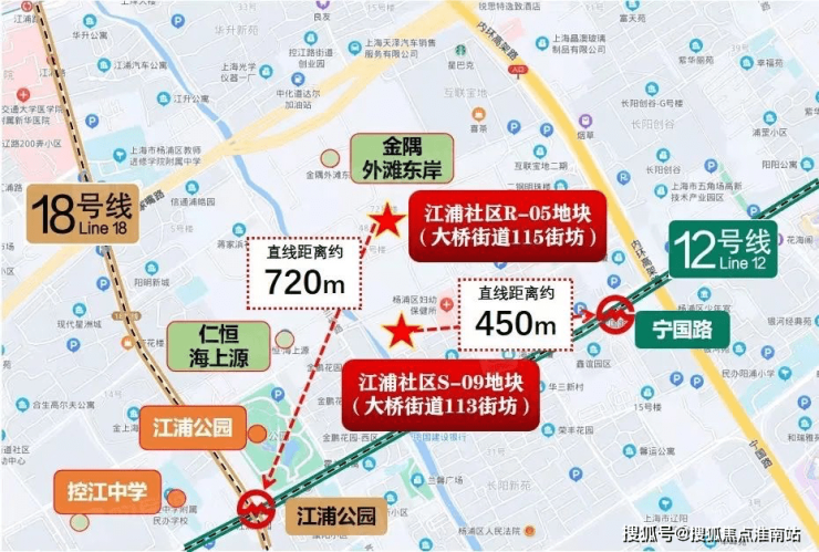 交通方面:双轨交环绕,交通网路通达性强,直达上海市各核心区域。项目距离18号线&12号线江浦公园站约500米;距离12号线宁国路站约500米;