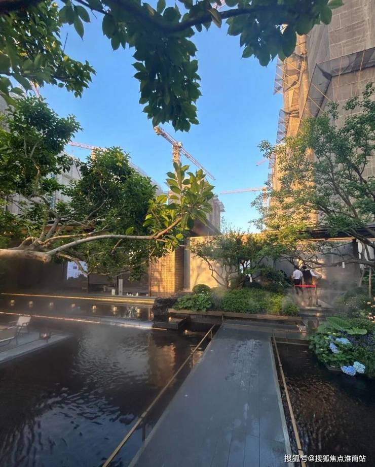 又比如,项目延续了张园“引水入园”的理念,将长200m近1000m²的水系覆盖到整个社区内。水景形态各异,有中心静水、三层跌水、点状涌泉、立面叠瀑、弧形流水五大不同呈现方式。水系的引入,让整个社区彻底灵动飘逸了起来。