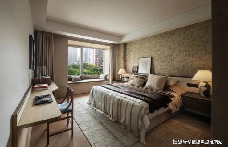 主卧、卫生间、衣帽间、书房通过廊道的关联被依次串联起来,让套房在功能上构成了简洁且有效的动线组合。主卧区域的采光极佳,窗外一片青翠,飘窗的场景化设计变成了这个空间的重点所在。在飘窗的内向包裹之下,150mm 高度的地台增强了飘窗的区域界定。主卧及书房立面的局部点缀了镜面材质,对空间起到了一定的延展作用。在特定区域的镜面反射之中,突出了艺术品在空间里的存在感,强化了空间与器物之间的紧密联系。