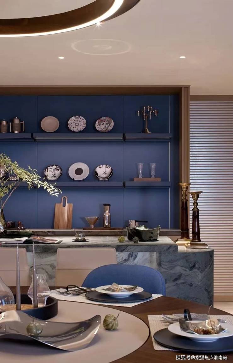 餐桌吊灯为琚宾团队设计的原创灯具;圆桌内置有内嵌式电动转盘,将生活的当代性隐入日常的使用中。