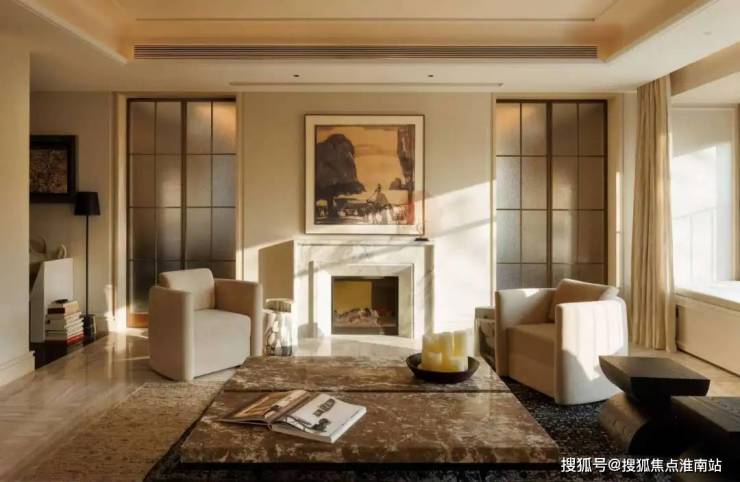 仪式感体现在对于材质和细节的精准把握和打磨之上,客餐厅选用天然大理石希腊木纹,通过纵横纹理拼接,让空间呈现精致而非繁复的优雅与奢华。沙发区域的壁炉设计,把对风格的需求转换为对观念和文化的获取。