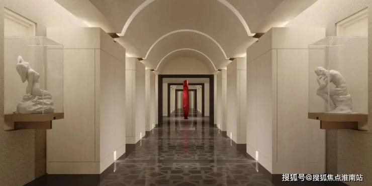 从海派入户旋转门推门而入,第一眼便能看到约13-15米的挑高大堂,艺术阶梯其作为艺术展示的重要空间,最大程度引入自然光,为空间打上朦胧、柔和的光感,融合左右两边的弧形柱体,犹如登山之“径”。