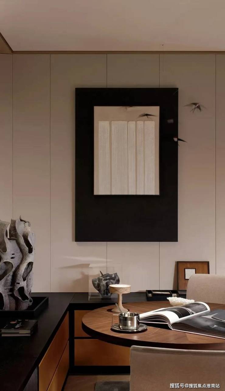 入户瞬间,心绪就静了下来,被宁和包裹。明亮的自然光透过远处超长百叶飘窗,充盈着室内。眼前,一座轻盈茶室如漂浮小岛,打破以往的格局经验,巧妙嵌入锁定视觉。半通透的屏风巧妙打散光线,若隐若现的朦胧之中,温润氛围弥散而开。