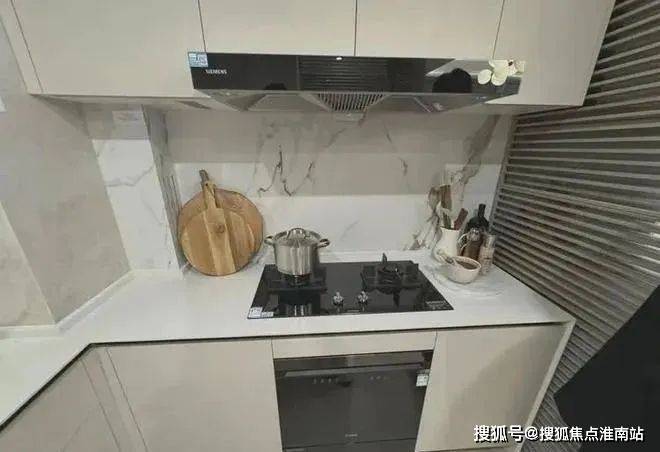厨房顶部是线性凉霸,比较美观,弗兰卡水槽、西门子油烟机和燃气灶、方太洗碗机。灶台背后也是一大块卡拉卡金奢板,颜值高也便于打理。