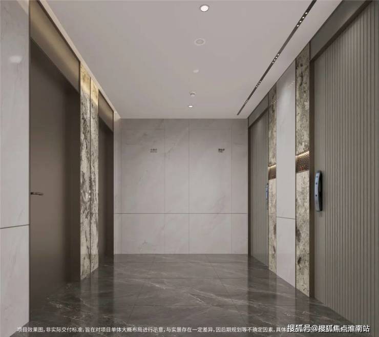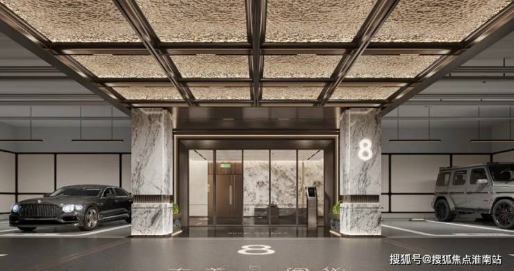 高定地下入户大堂,延续首层入户大堂材质高标,精选雪山银狐天然透光奢石,营造精奢生活质感。