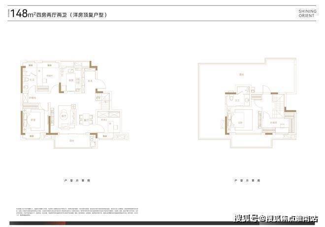 叠墅总高四层,设计了邻里空间,单元门设计也是非常的大气。上叠125㎡三房两厅三卫,顶楼闷顶层等可以拓展空间;下叠140㎡四房两厅三卫,另有超宽裕的赠送面积。