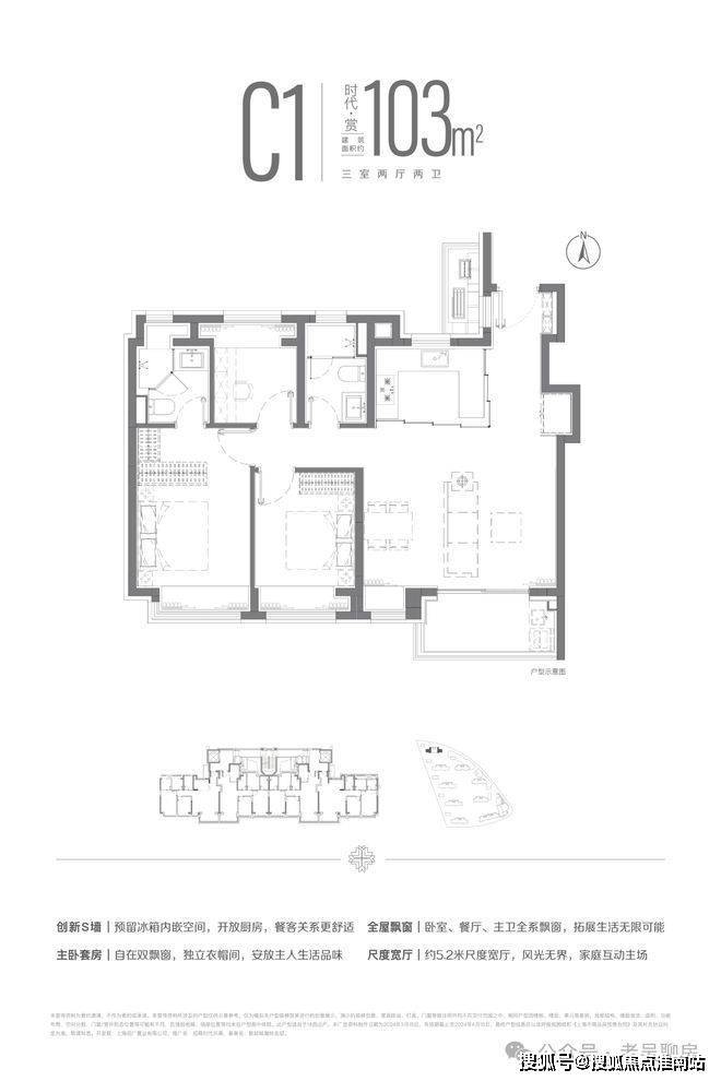 建面约103m²三房两厅两卫户型,南北双卧L型270°揽境飘窗设计,更大限度地让自然融入与自在之中,更宽阔的空间尺度,让自在生长与自然之中。