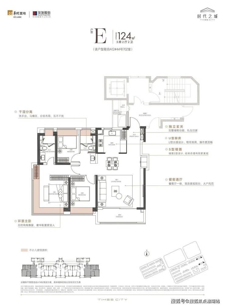 建面约124㎡3房2厅2卫,总价约596-693万,同样是经典的动静分离户型,属于改善型3房,各空间居住舒适度更强,该户型均为边套,主卧为270°转角飘窗;