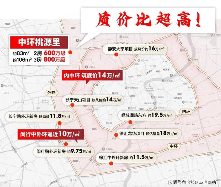再看中外环,徐汇、长宁项目11-12万/㎡,闵行楼盘都要逼近10万/㎡。
