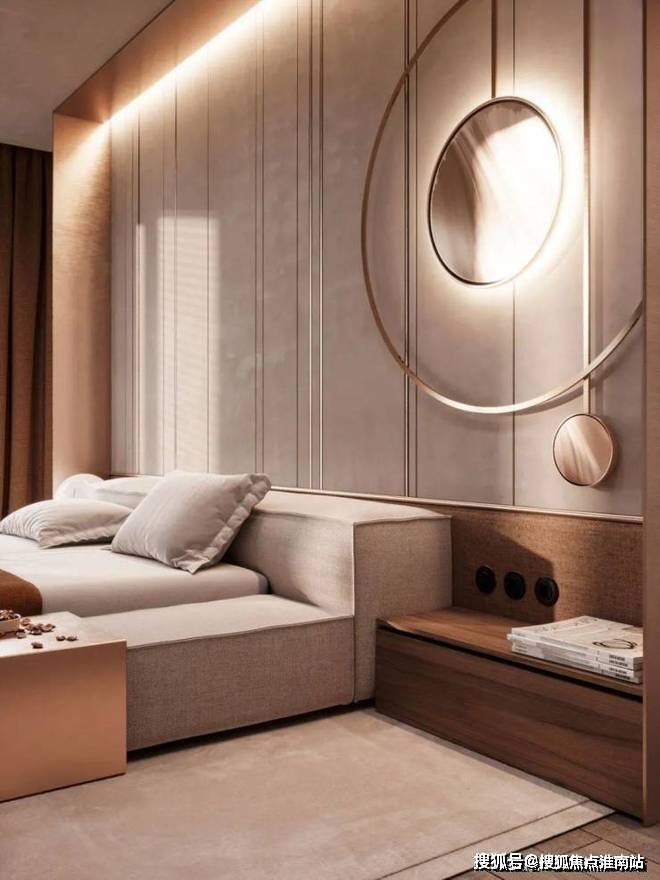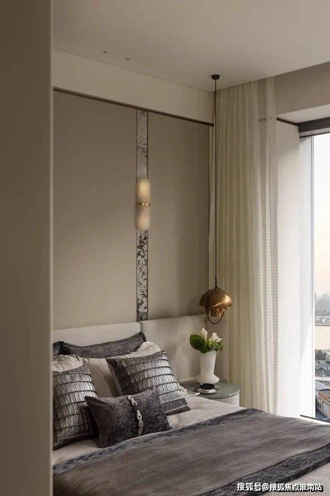主卧室大气、质感,用简单的造型背景墙和圆形灯就渲染出了卧室的调性,仅用灰色和棕色便提升了空间的精致感。设计师钟爱用线条来映衬出空间的动静感。