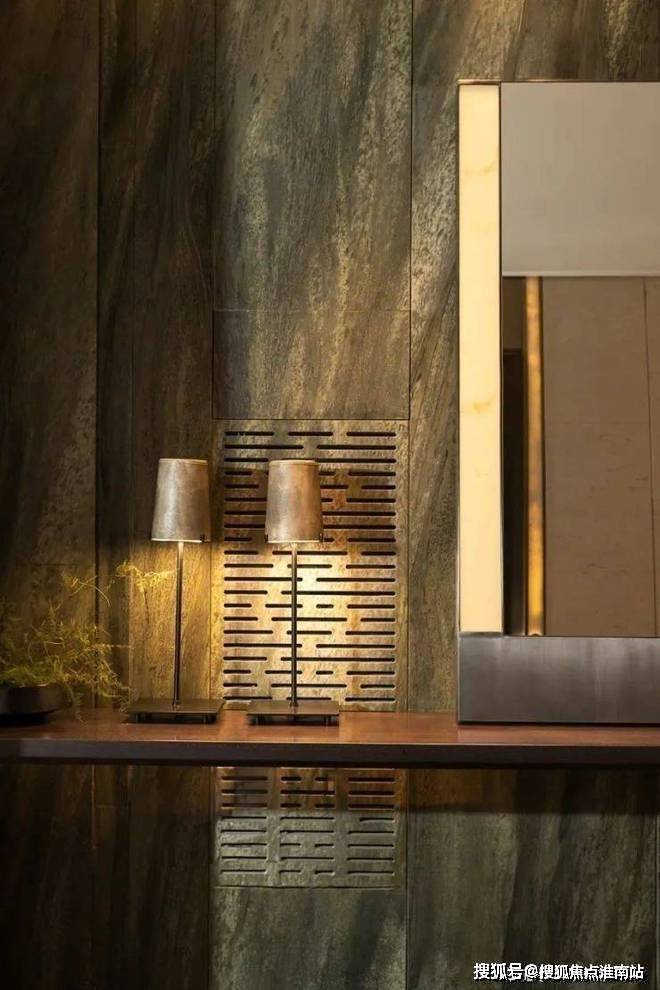 阶梯处更具艺术氛围,里面装饰墙凹凸不平,拾级而上,垂挂的金属吊灯有条不紊,营造了一种浪漫而温馨的氛围感。