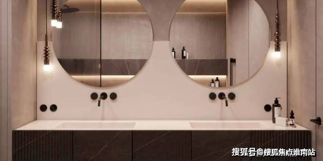 卫生间宽敞而明亮,摈弃过多的射灯或主灯,而是沿用部分照明灯具,立面的装饰线条参差不齐却独有韵味,深色大理石柜体压低了空间的调性,让空间的层次轻重分明。