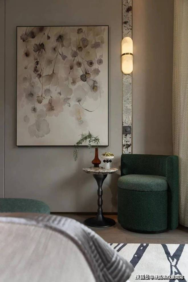 客厅的观感舒适而有格调,半面的自然光线引入空间,软包沙发烘托出沁人心脾的柔和氛围。一桌、一椅、一凳,都融合的恰到好处。