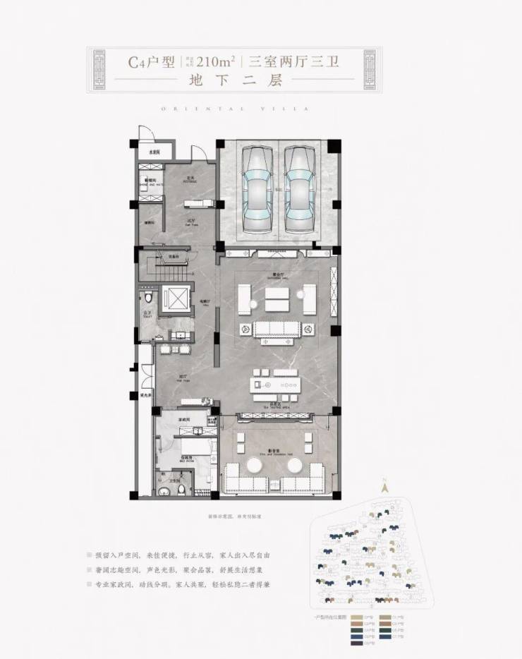 以项目东北角的建面约330㎡H户型为例,地下二层的室内可配置保姆房、家政间、影音室、酒窖、棋牌室、品茗区,室外可设置一个园池檐亭的中式庭院。
