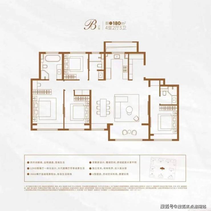 该户型集LDBK一体化、玄关入户、动静分区设计、U型厨房、双卧飘窗、强大收纳等多重优势于一体,在功能性与舒适度上几乎都做到了极致!