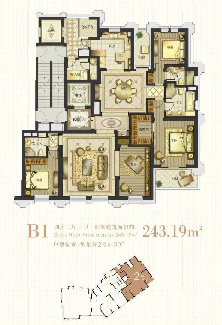 2号楼01室:243㎡4房2厅4卫,客厅朝南,三房朝南,一房朝北