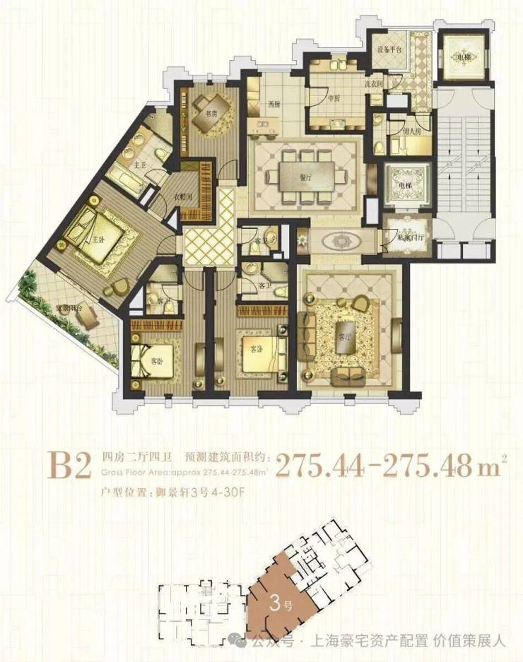 3号01室:275㎡4房2厅4卫,客厅朝东朝北,客厅和三个房间朝南,书房朝北