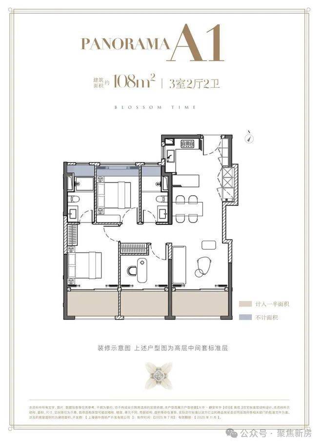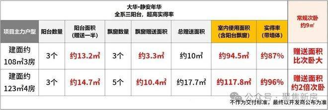 建面约108㎡3房,三阳台面积达约13㎡(赠送一半),飘窗赠送约3.3㎡,室内使用面积达约94.5㎡,实得率高达约87%,总赠送面积比常规次卧都大。