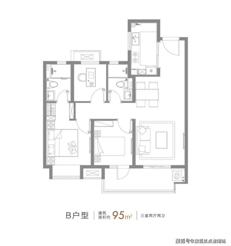 建面约95㎡的3房2厅2卫户型,可以说是刚需置业一步到位的户型,从二人世界到二胎家庭的全生命周期需求都能满足。