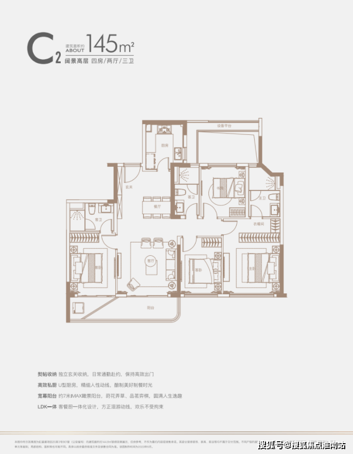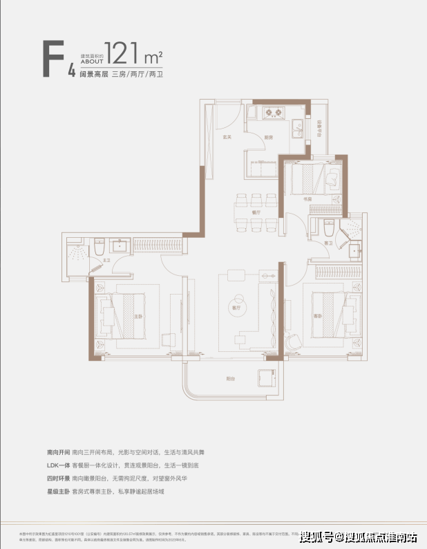 建面约140㎡四房:三开间朝南户型,南北通透,采光条件优质,客厅明亮宽敞,彰显大气布局。