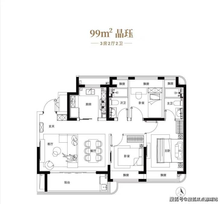 约99平3房户型,宽厅设计,空间感十足,搭配超大阳台,景观视角绝佳,U型厨房,全屋飘窗。