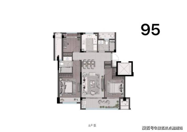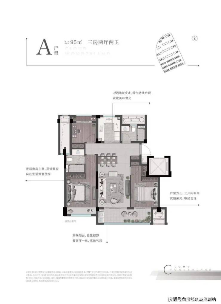 首开大火的建面约95㎡户型,三开间朝南布局,厨房U型设计,放得下双开门冰箱,让下厨不再拥挤。南向面宽达到了约9.7米,约6.4米宽的双联阳台,洗衣晾晒、品茗观景各有天地,巧妙避免了坐在客厅的客人抬头就能看到晾晒衣物的场景。北面房间外接一步阳台,主卧套房配备景观飘窗,让风景柔软主人的私密时光。