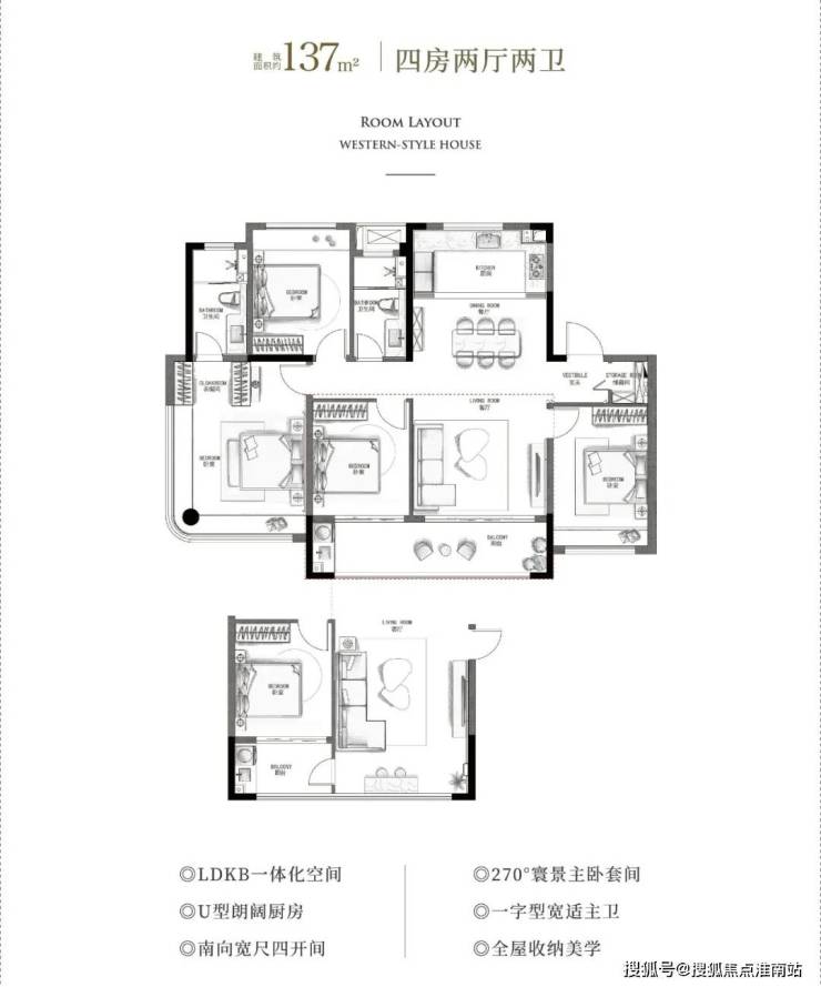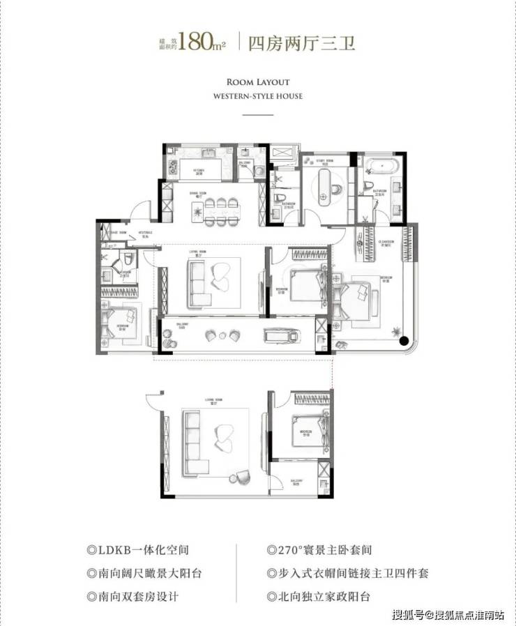 东边户为4房2厅3卫,南向面宽约17.05米,四开间朝南。LDKB一体设计,主卧为套房+270°全景飘窗,主卫带浴缸。