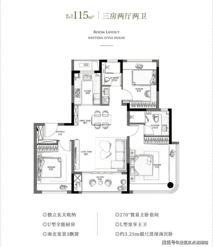 东边户为3房2厅2卫,南向三开间,LDKB一体设计,封闭阳台开间约4.6米,全屋有4个飘窗,增强室内通透性。